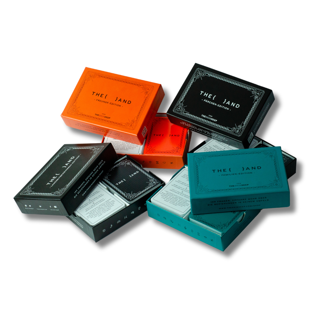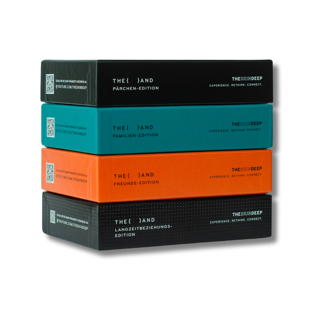 Wenn du alle Erinnerungen und Verbindungen von The Skin Deep erleben möchtest, aber 199 Fragen nicht ausreichen, dann sind unsere Pakete genau das Richtige für dich! Jedes tolle Paket enthält mehr Fragen und mehr Erlebnisse, sodass du unzählige Gespräche führen kannst, an die du dich für immer erinnern wirst.
